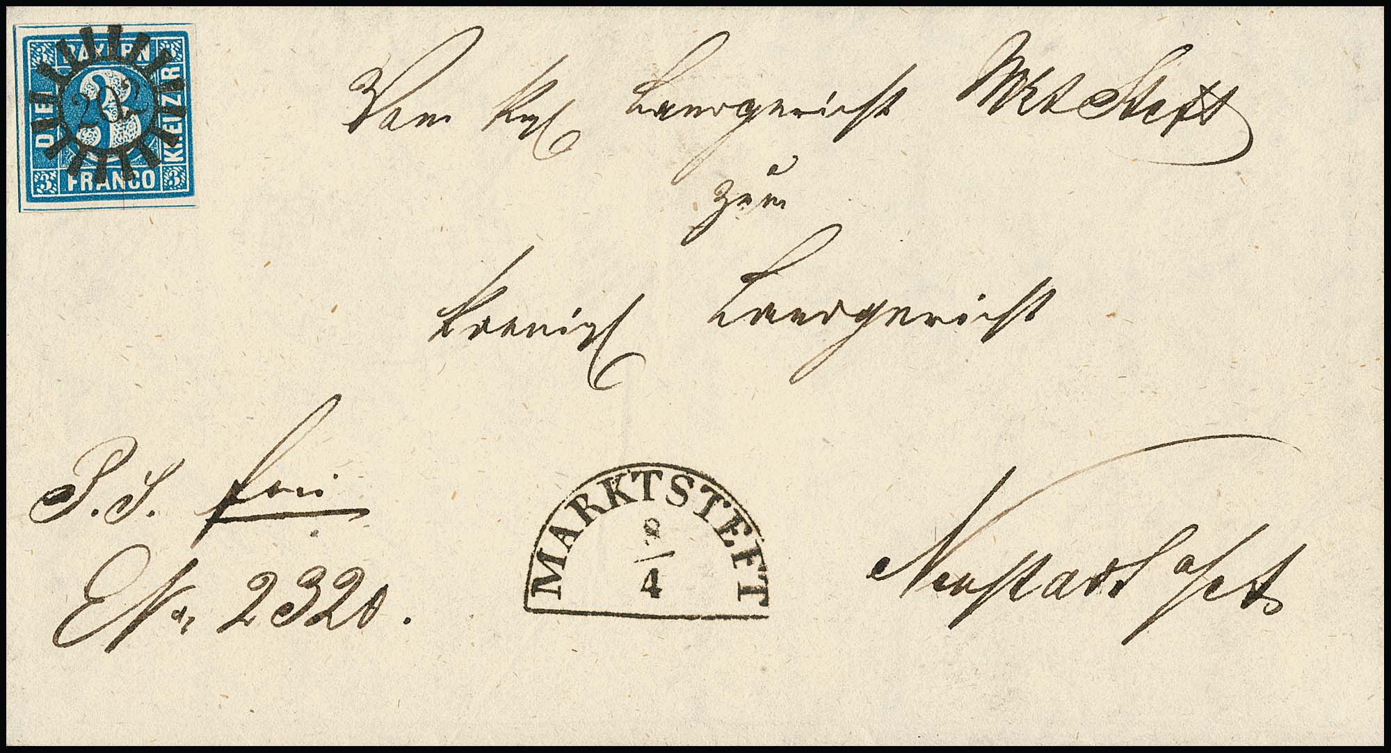 "202", idealer gMR nebst HK "Marktsteft" auf Luxusbrief 3 Kr. blau