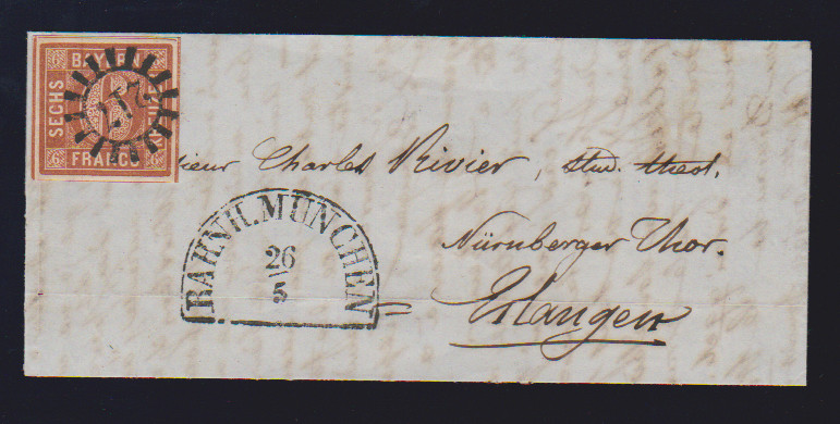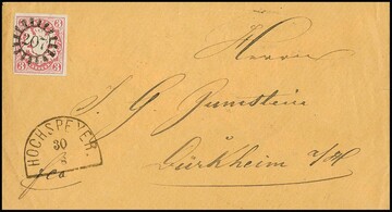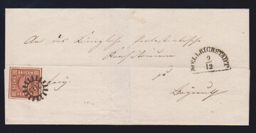 "212", gMR nebst HK "Hofheim" auf Kabinettbrief 3 Kr. rot an den Freiherrn von Truchsess in Wetzhausen, "Post Stadtlauringen", ferner Luxusbrief 9 Kr. braun mit gMR "217" und HK "Bahnh. München"