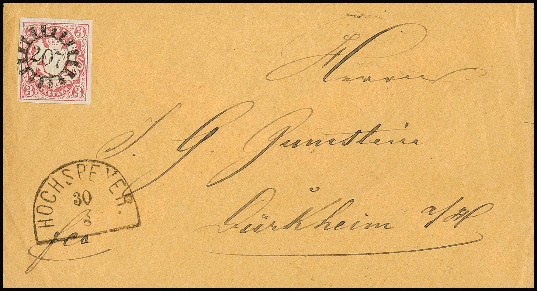 "207", gMR nebst HK "Hochspeyer" auf blauem und auf beigem Kabinettcouvert 3 Kr. rosa aus gleicher Korrespondenz, offensichtlich zwei Damenbriefe