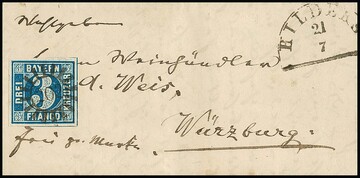 "202", gMR nebst HK "Marktsteft" bzw. "Hilders" je klar auf zwei Kabinettbriefen 3 Kr. blau, I. und II. Verteilung, erster Brief typische Faltspur