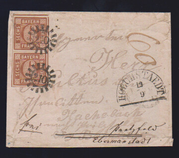 "210", gMR nebst HK "Hoechstadt" auf Nachsende-Teilbrief mit Prachtpaar 6 Kr. braun aus der rechten oberen Bogenecke, sign. Sem