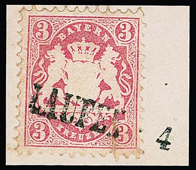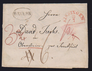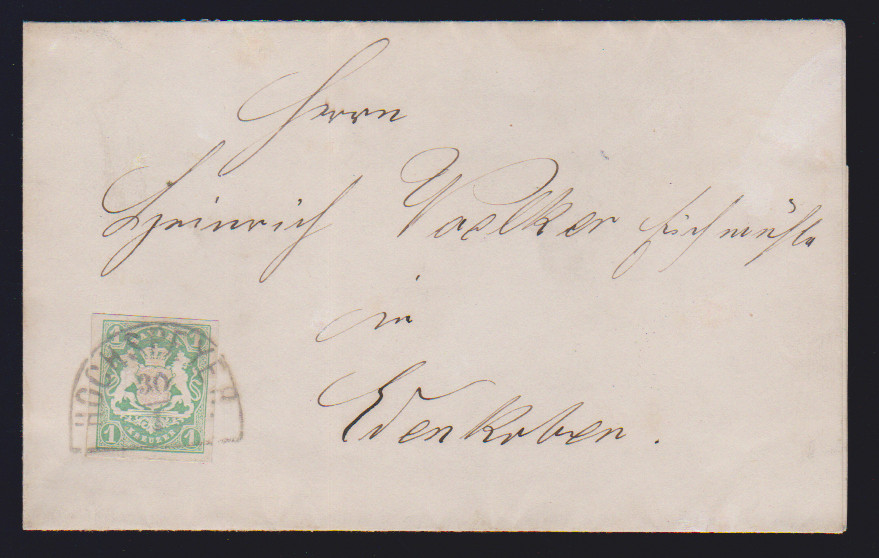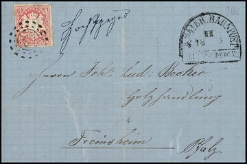 "Hochspeyer", hs. Bahnpost-Aufgabe, nebst Zug-HK "Frankenth.-Worms", sowie oMR "B.P." als Markenentwertung, auf zweifach gef. Brief mit Wappen 3 Kr.