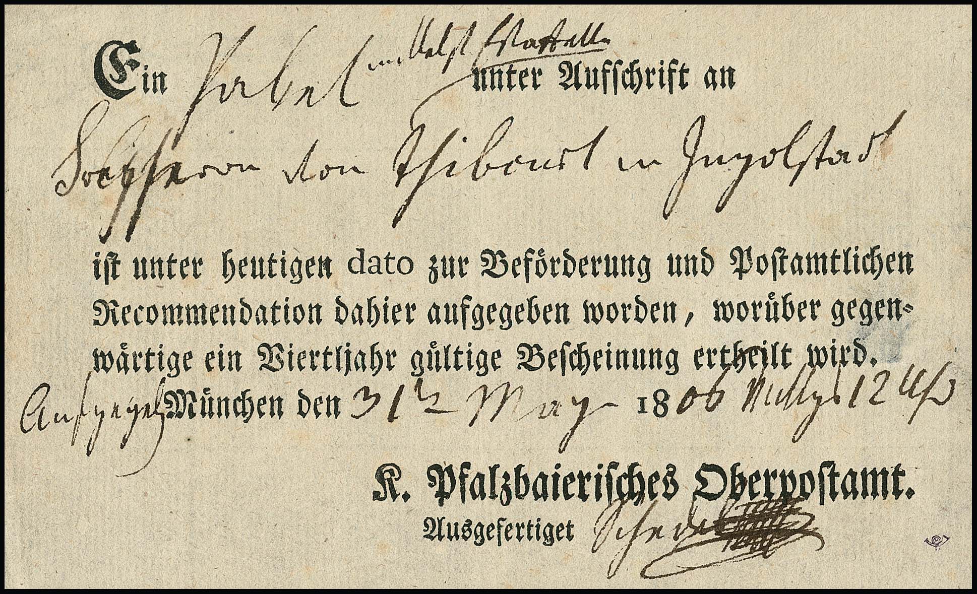"München", 1806, ("Mittags 12 Uhr"), seltener Ortsdruck-Postschein "R. Pfalzbaierisches Oberpostamt" für ein Paket mittels Estaffette nach Ingolstadt