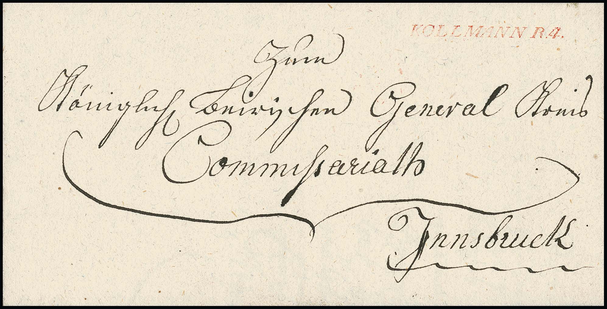 "Kollmann R.4.", 1813, klarer roter L1 auf frischem Brief mit Inhalt nach Innsbruck. Sehr seltener Stempel aus der Zeit der bayerischen Besetzung in Tirol, keine handvoll Belegstücke bekannt