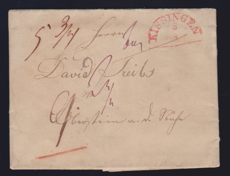 "Kissingen", 1844/45, je roter HK, einmal nebst schwarzem Ovalstempel "Bayern", auf zwei Briefen nach Oberstein