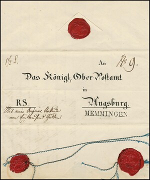 "Memmingen", 1842, L1 auf dreifach versiegeltem Postbrief an das königliche Ober-Postamt in Augsburg, eine Dienst-Kaution betreffend mit einer Original-Urkunde über 1000 (!) Gulden. Schöner Brief!