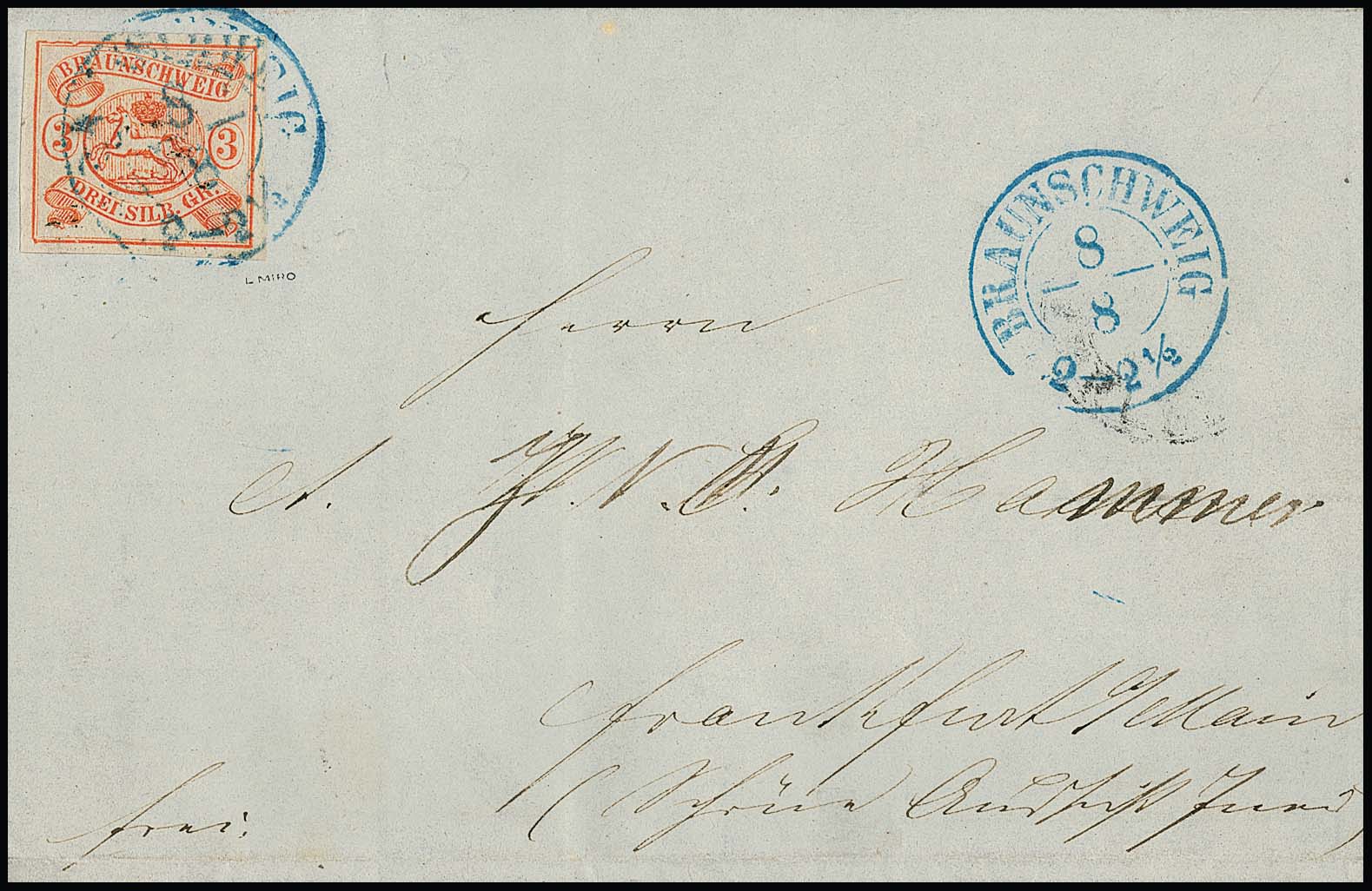 3 Sgr. orangerot, Kabinettstück mit deutlichem Plattenfehler "Randlinie links oben mehrfach eingekerbt" auf Brief 1855 mit K2 "Braunschweig" nach Frankfurt (Adreßname etwas verändert), sign. Miro