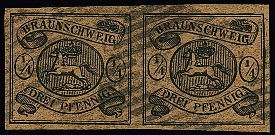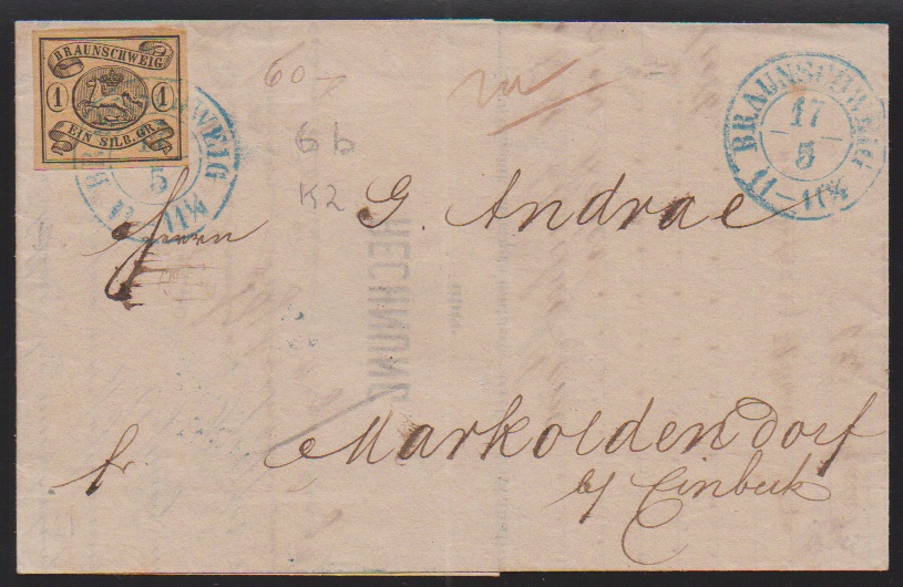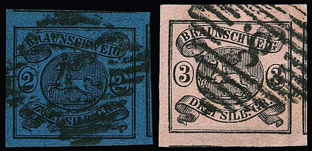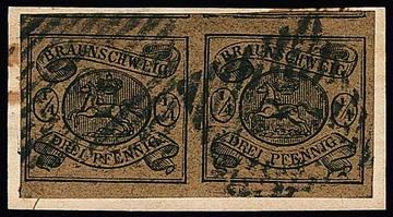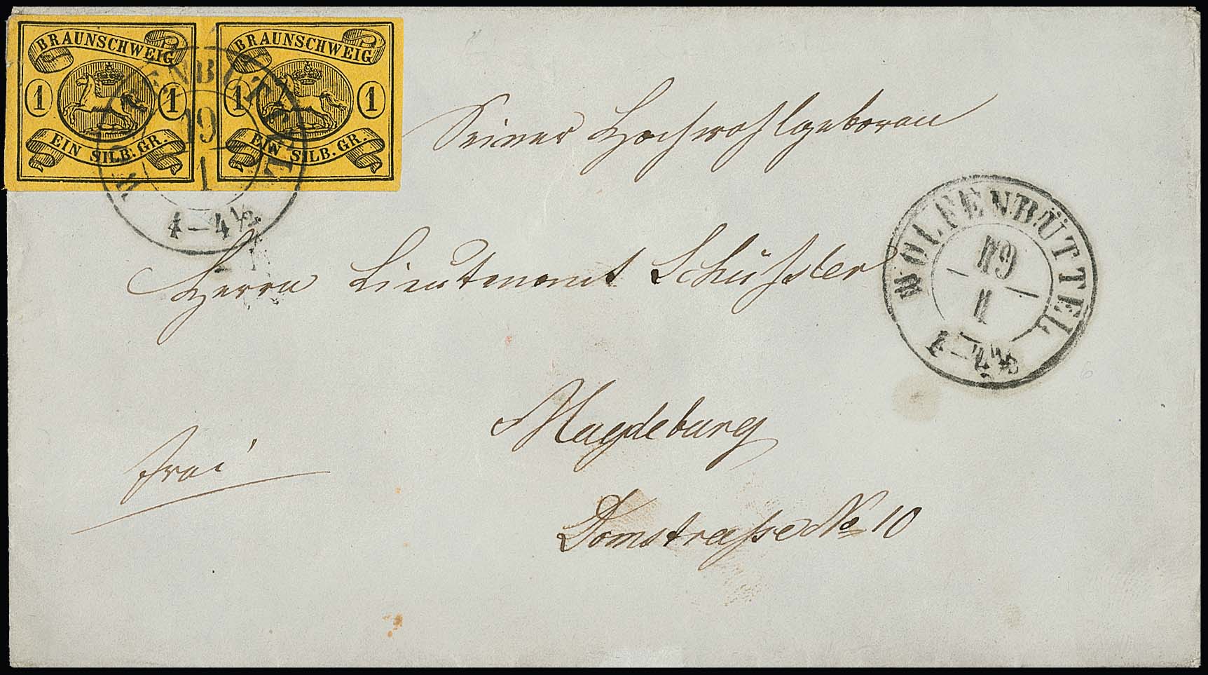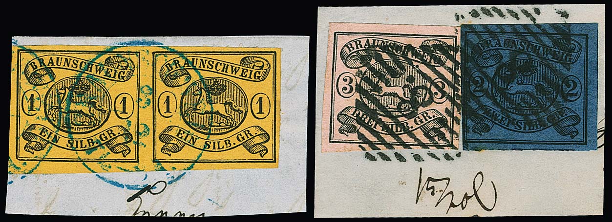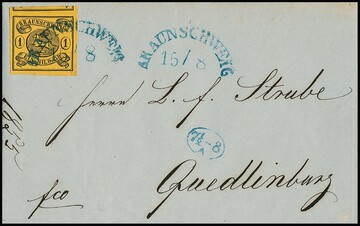 1 Sgr. schw./sämisch, Wasserzeichen "Mundstück nach links", Kabinettstück einzeln auf Brief von Braunschweig, sowie im Paar (ein Wert kl. Randspalt, gut sign. Lange) auf Couvert mit K2 "Wolfenbüttel"