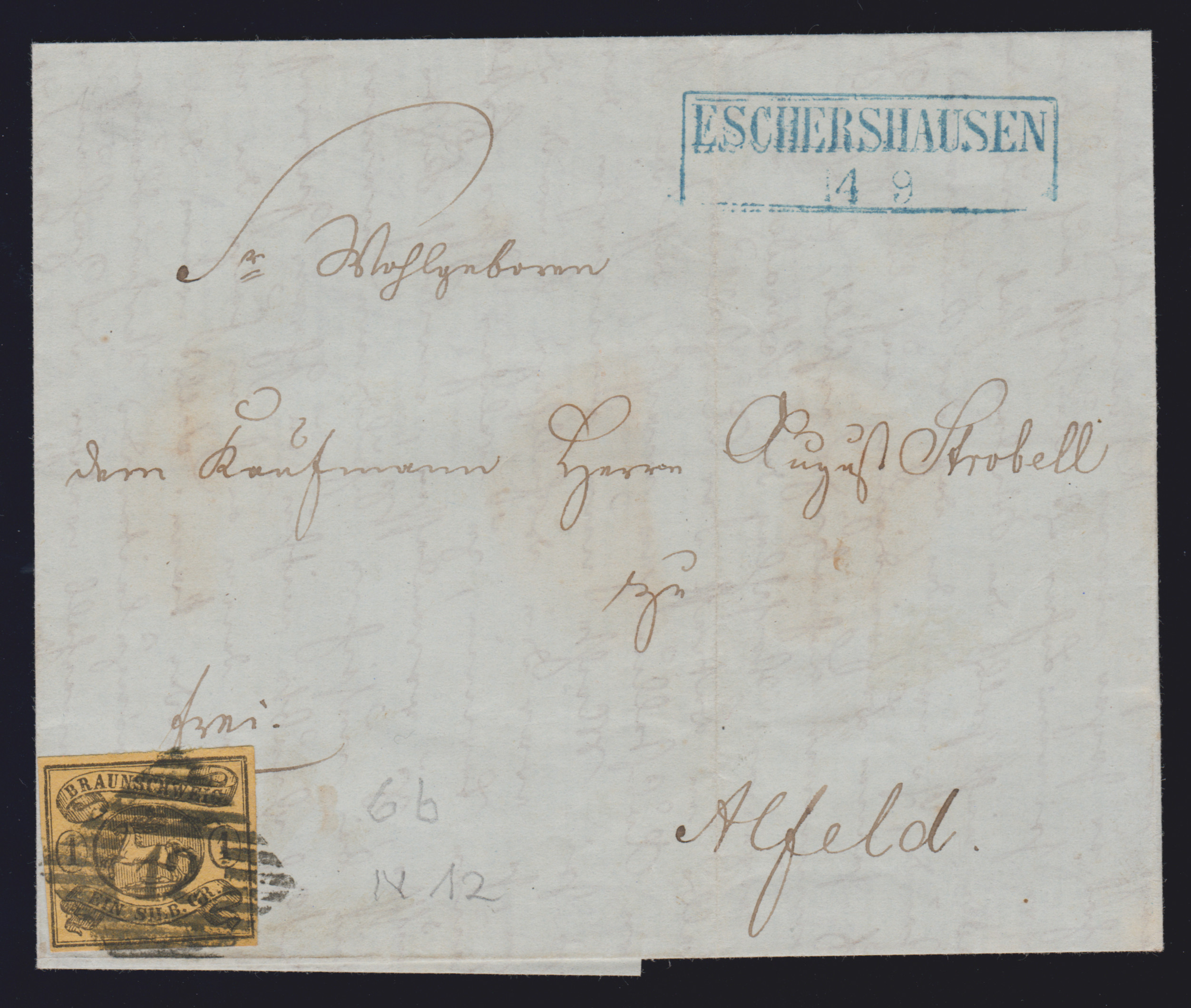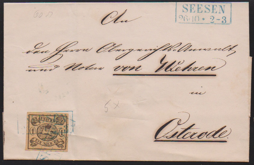 1 Sgr. schw./sämisch, Wasserzeichen "Mundstück nach links", breitrandig, auf Prachtbrief mit zweifachem Ra2 "Seesen"