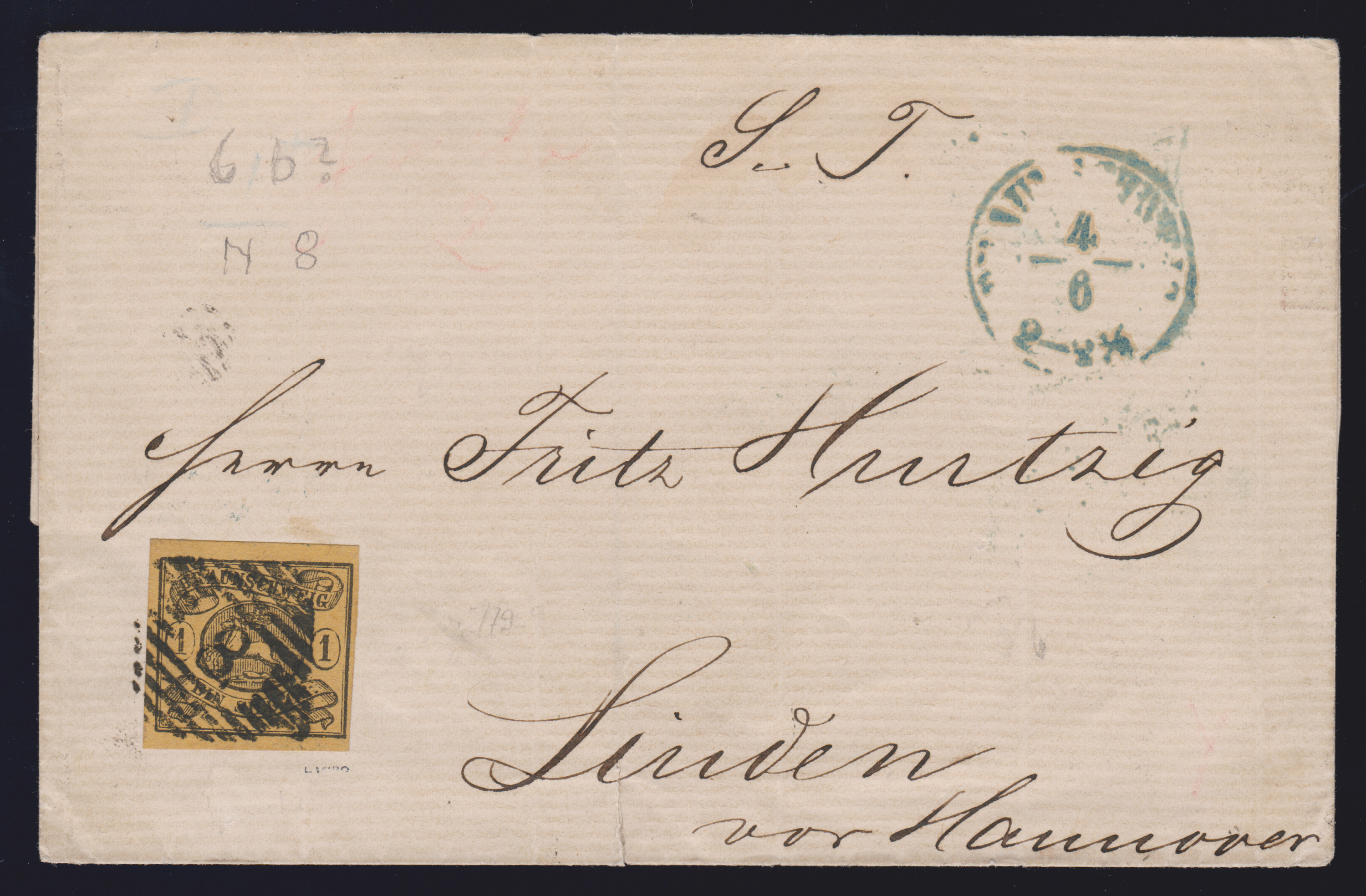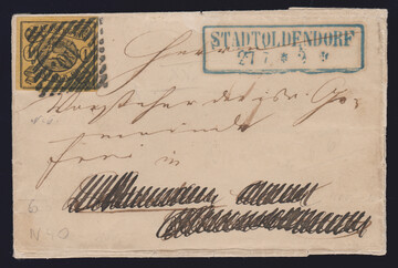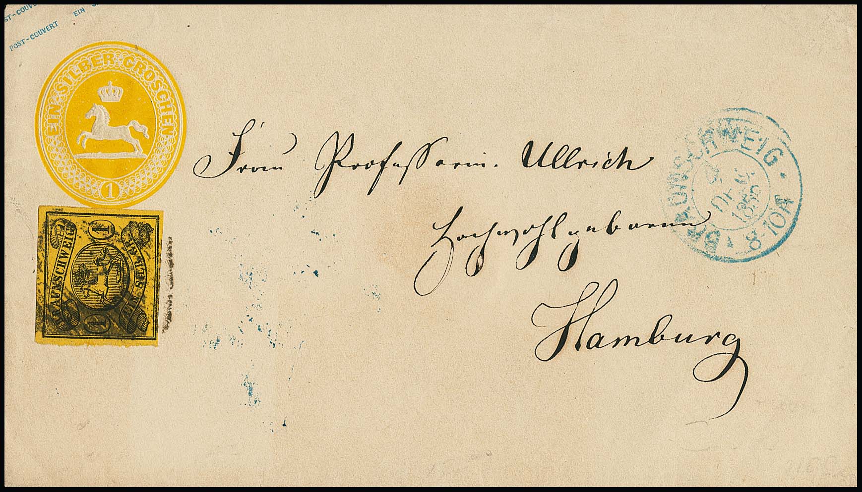 1 Sgr. schw./sämisch, Prachtstück auf Ganzsache 1 Sgr. gelborange (rs. obere Viertelklappe kleiner Öffnungsmgl.), von Braunschweig nach Hamburg