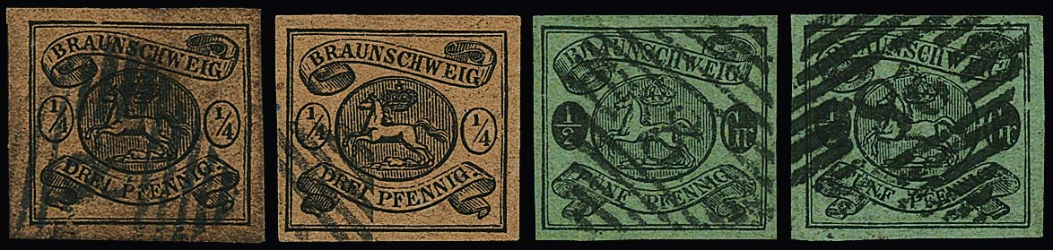 1/4 Ggr. schw./braun, 1/2 Gr. schw./grün (zweimal dünnes Papier), je vier breitrandige gest. Kabinettstücke, acht Befunde Dr. Wilderbeek, einmal sign. Engel. Mi. 2880,-