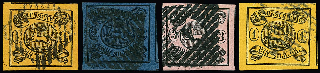 1 Sgr. schw./bräunlichgelb, 2 Sgr. schw./blau, 3 Sgr. schw./lebhaftrosa und 1 Sgr. schw./gelb, je extrem breitrandige Luxusstücke (alle mit Nebenmarke), Fotoexp. Lange, Wilderbeek, Nr. 7 sign. Lange