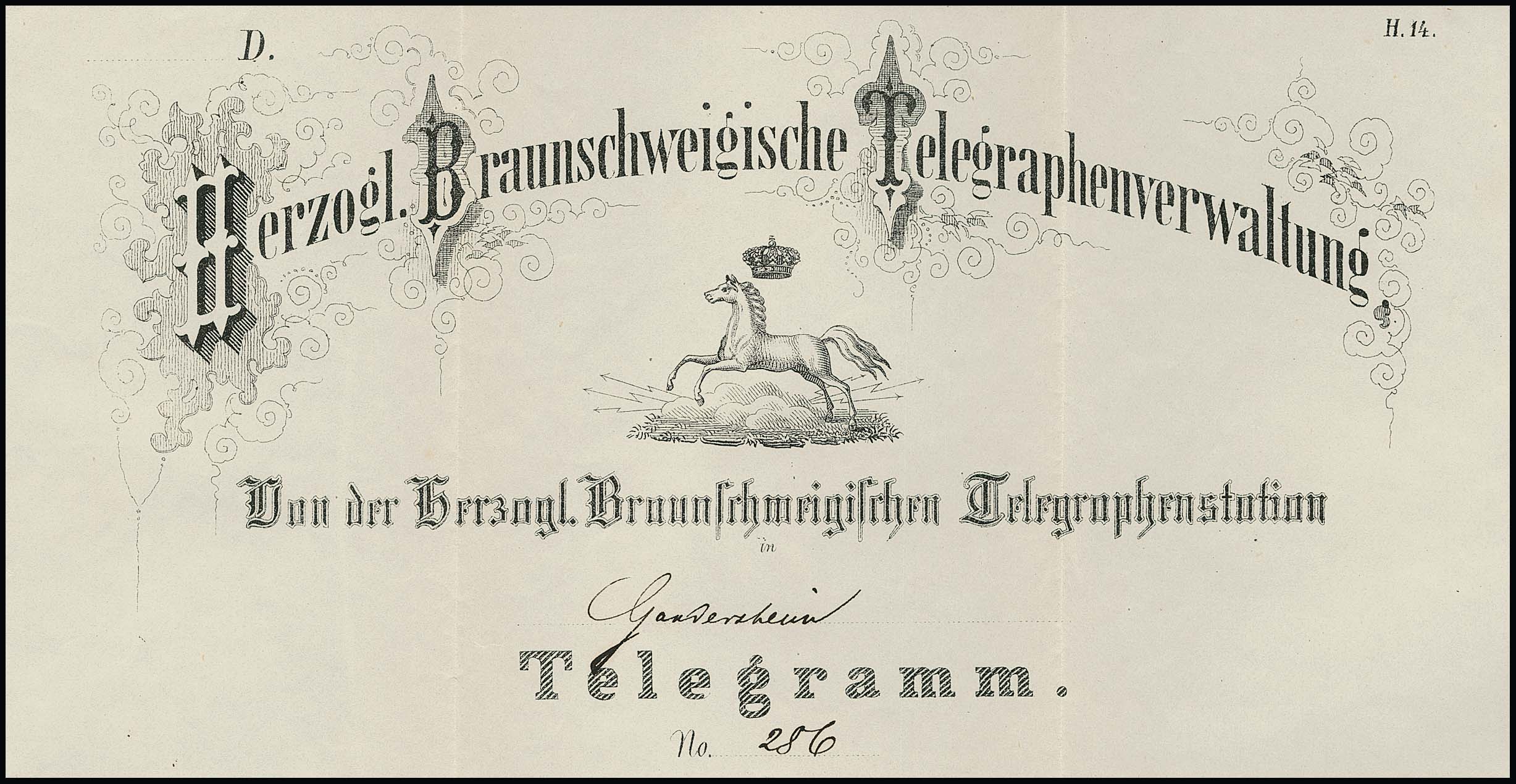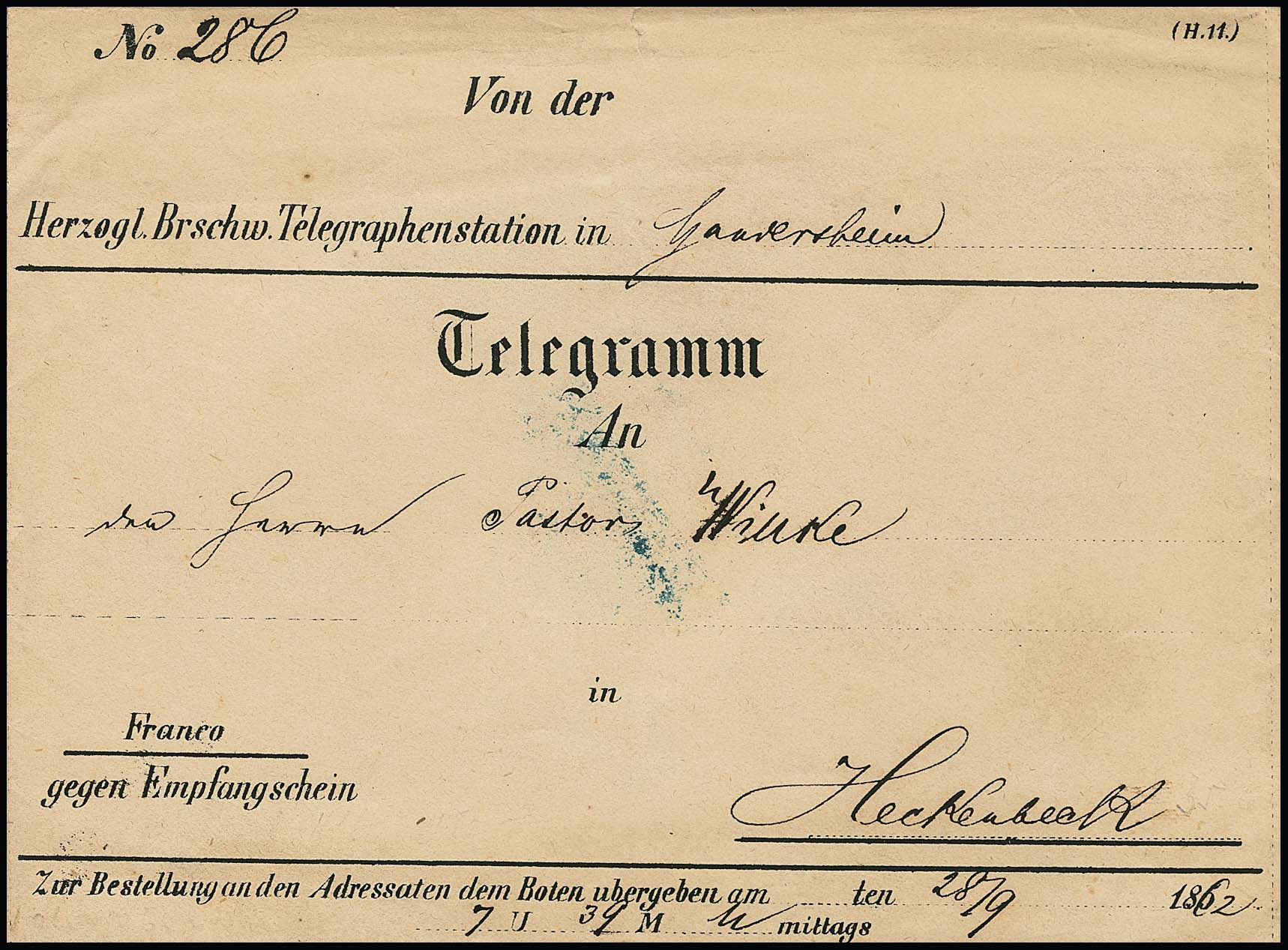 "Gandersheim", 1862, seltenes vollständiges Telegrammcouvert (typische Spuren) mit Telegramm-Inhalt nach Heckenbeck