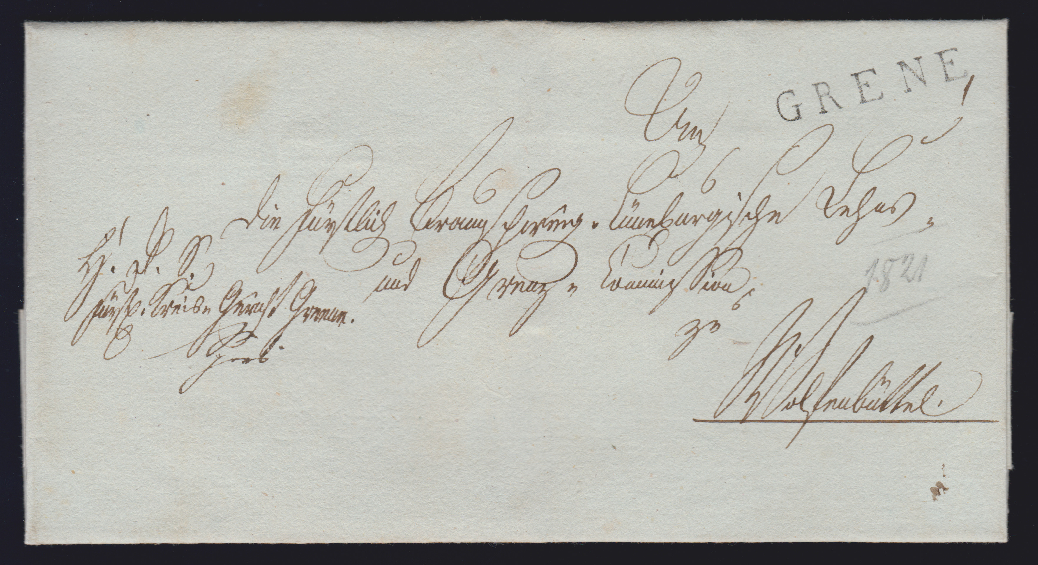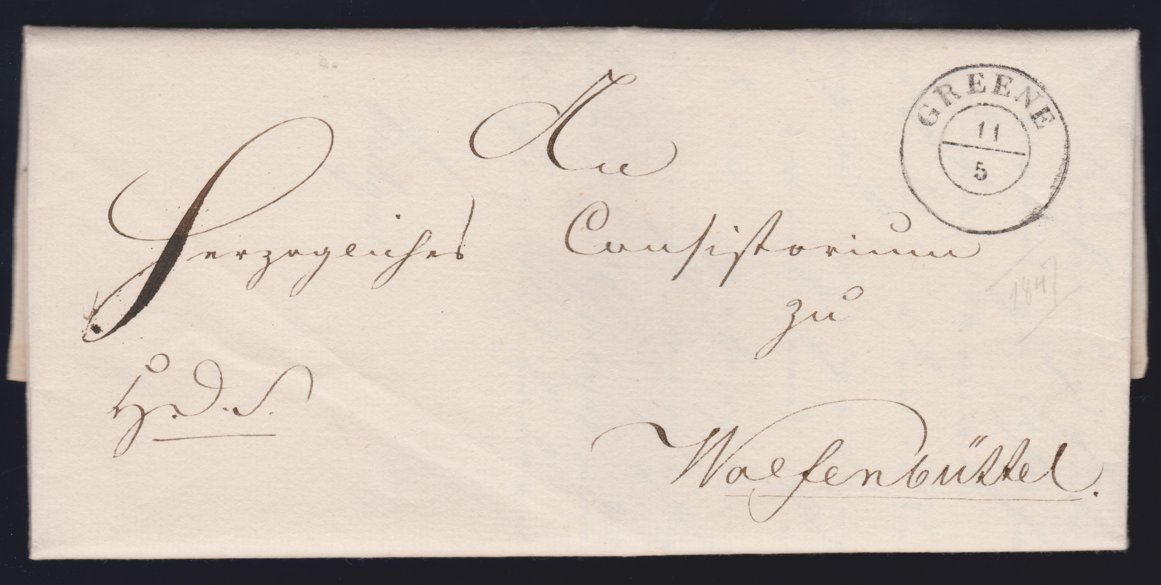 "Greene", drei Briefe mit unterschiedlichen handschriftlichen Aufgaben, 1770 "de Greene" in Rötel, 1798 "Gr." in Rötel, sowie 1802 "v. Greeene", dazu vorphil. L1 und K2 auf zwei Briefen