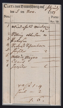"Braunschweig", 1787, seltene Ortsdruck-"Carta" nach Holzminden mit Portoauflistung der Briefe