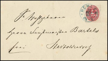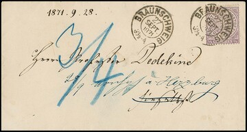 "Blankenburg", K2 vom 31.12.1871 auf unfrankiertem Brief (Neben-Ra2 "AUS DEM BRIEFKASTEN"), 2 Gr. Nachporto und hs. "Attestiert Husteck" (Postmeister 1872-1874) nach Wolfenbüttel, rs. großer K2 "WOLFENBÜTTEL 1.1." (1872), ein bemerkenswerter Letzttagsbrief der braunschweig. Post