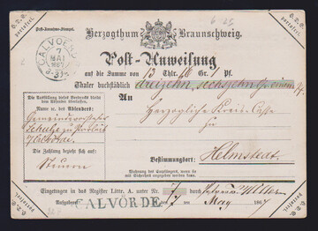 "Calvoerde", 1867, sowohl blauer K2 als auch L1 (!) auf Postanweisung, ex Dr. Marx
