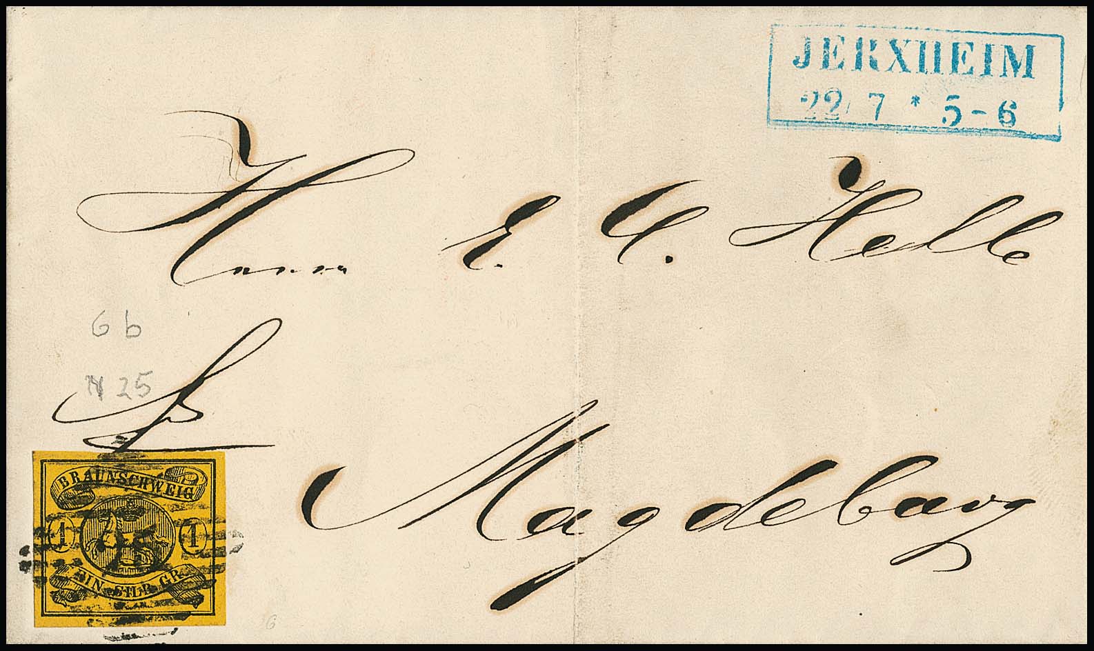 "25" nebst blauem Ra2 "Jerxheim" auf Brief (Mittelfalte) mit breitrandigem Kabinettstück 1 Sgr.