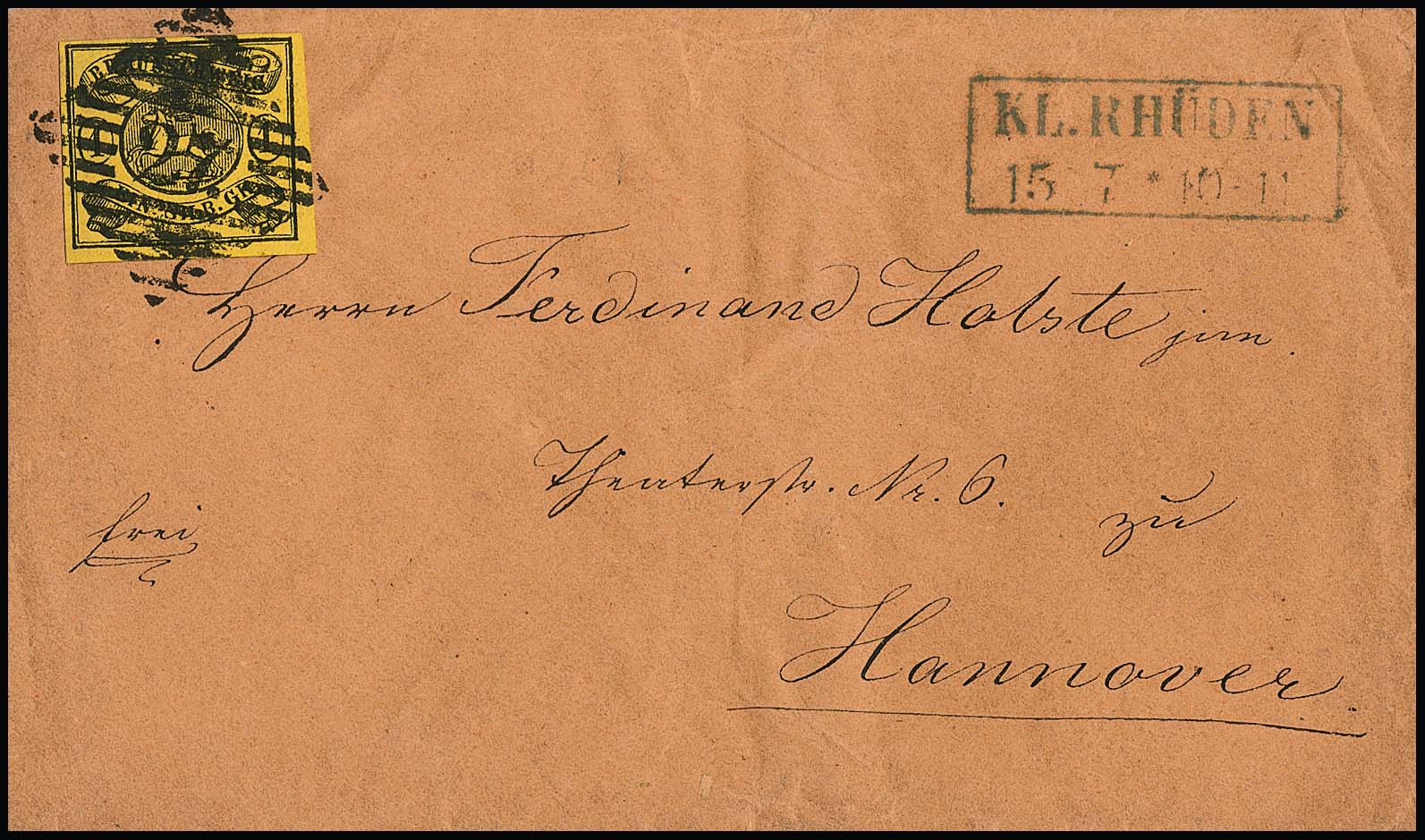 "27" sehr klar nebst blauem Ra2 "Kl. Rhüden" auf dunkelorangem Couvert mit Kabinettstück 1 Sgr.