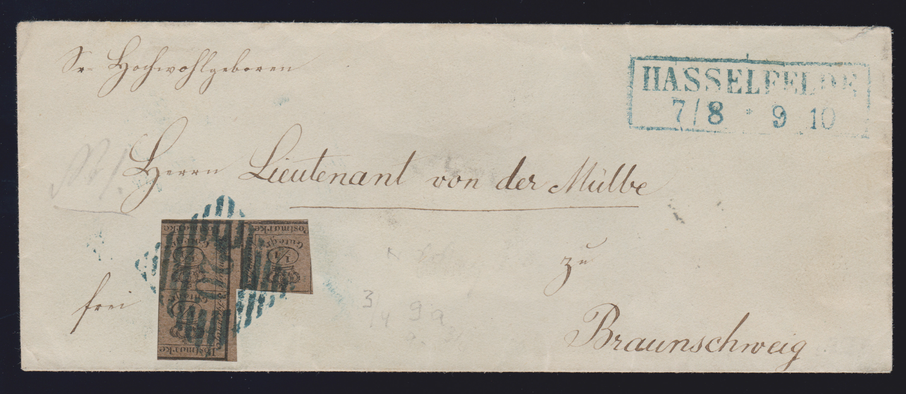 "20" nebst Ra2 "Hasselfelde", je in blau, auf Damencouvert mit üblich geschnittenen 3/4 Ggr.