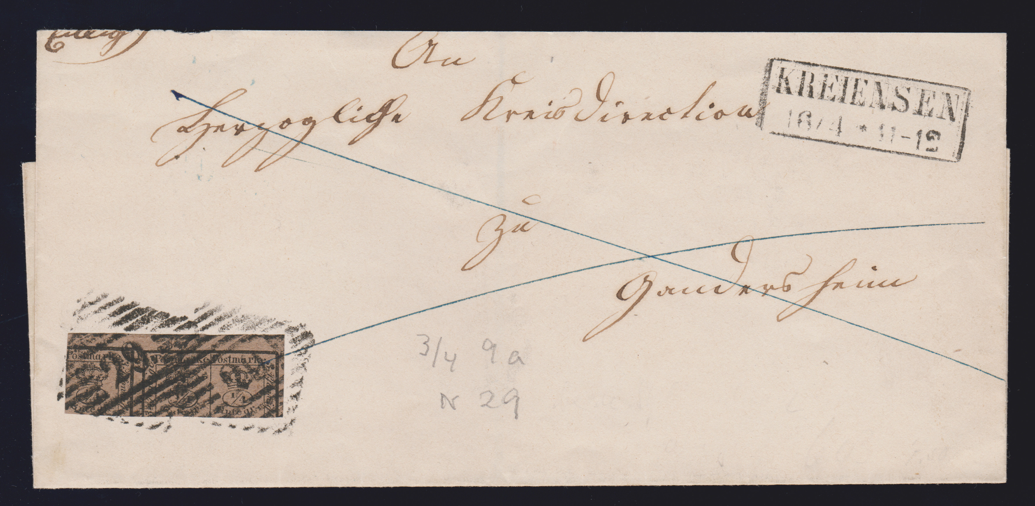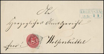 "29" nebst blauem Ra2 "Kreiensen" klar auf Prachtbrief Wappen 1 Gr., beim Brief fehlen die seitlichen Klappenteile