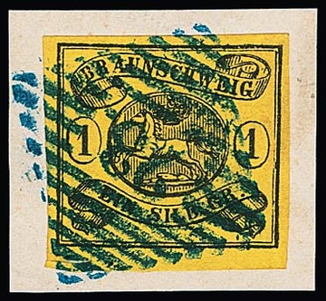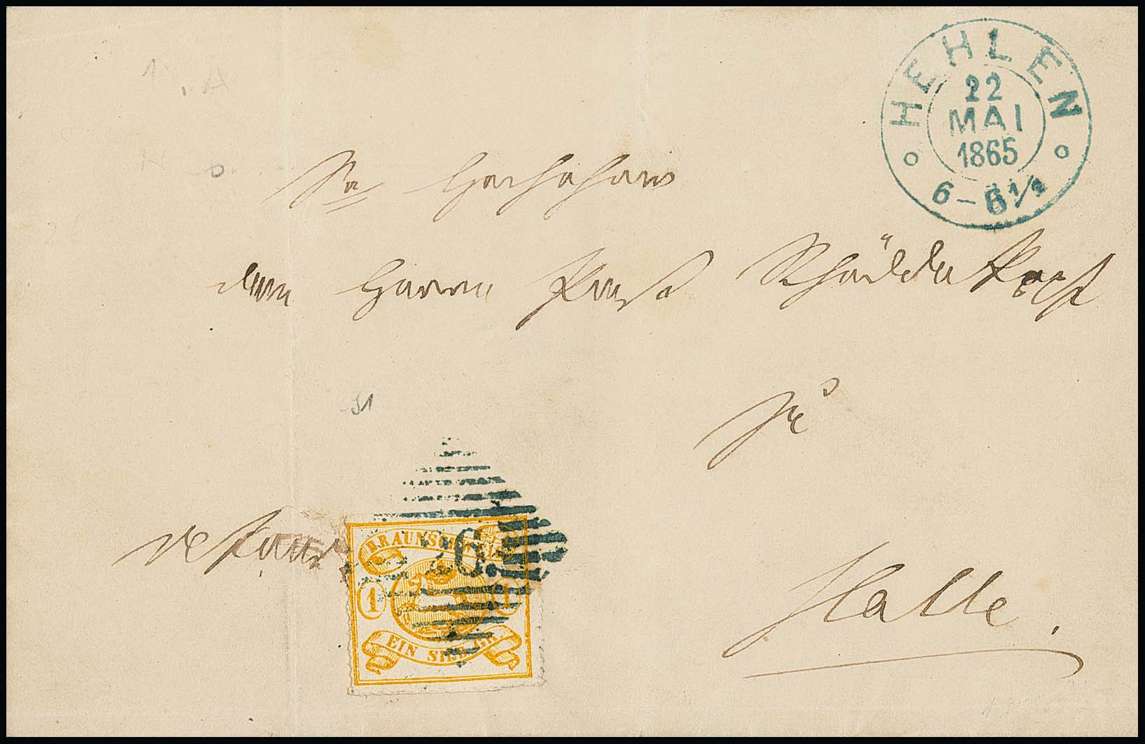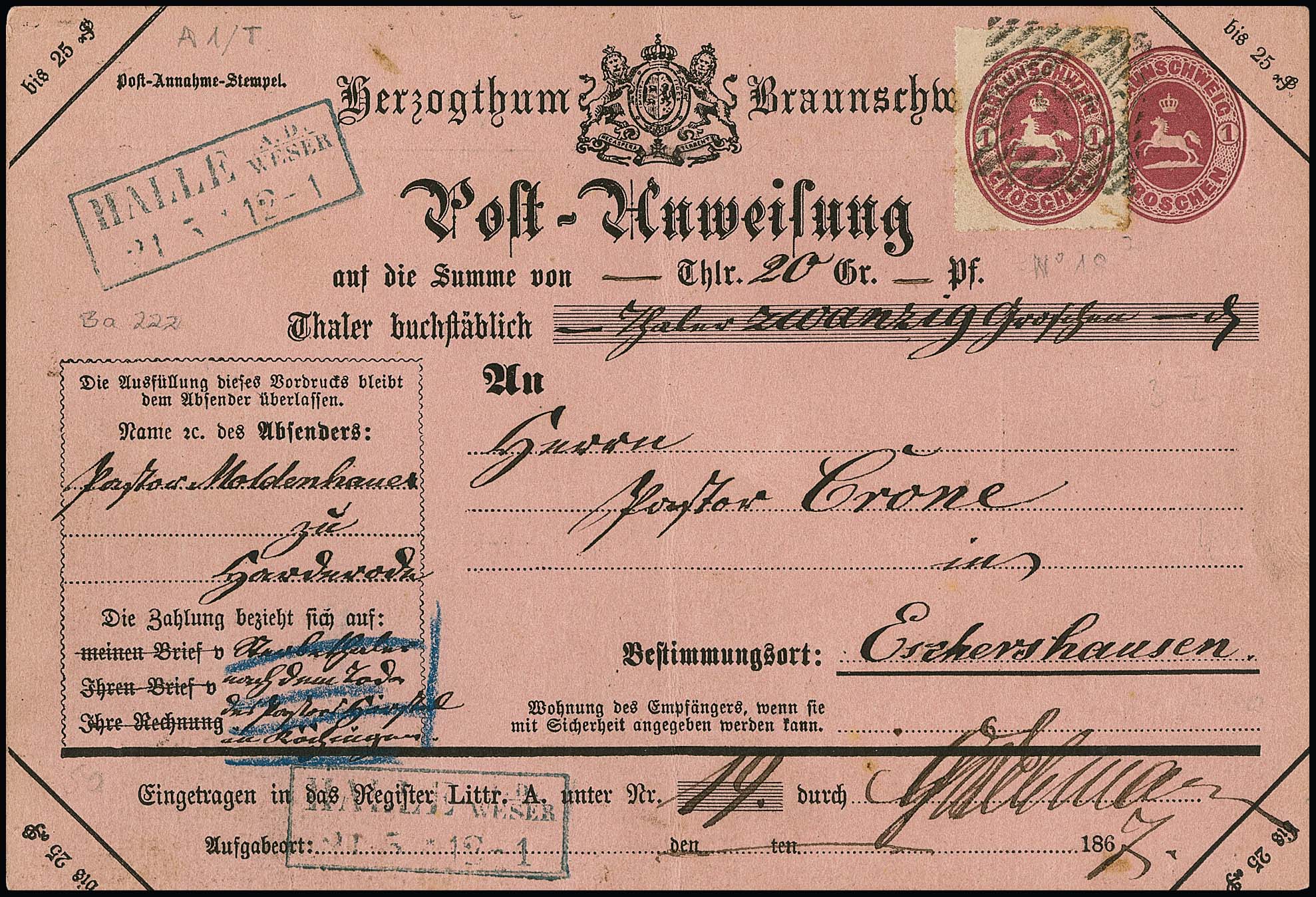 "18" nebst blauem Ra2 "Halle a.d. Weser" auf Postanweisung 1 Gr. mit ZuF Wappen 1 Gr. rosa, min. Mgl.