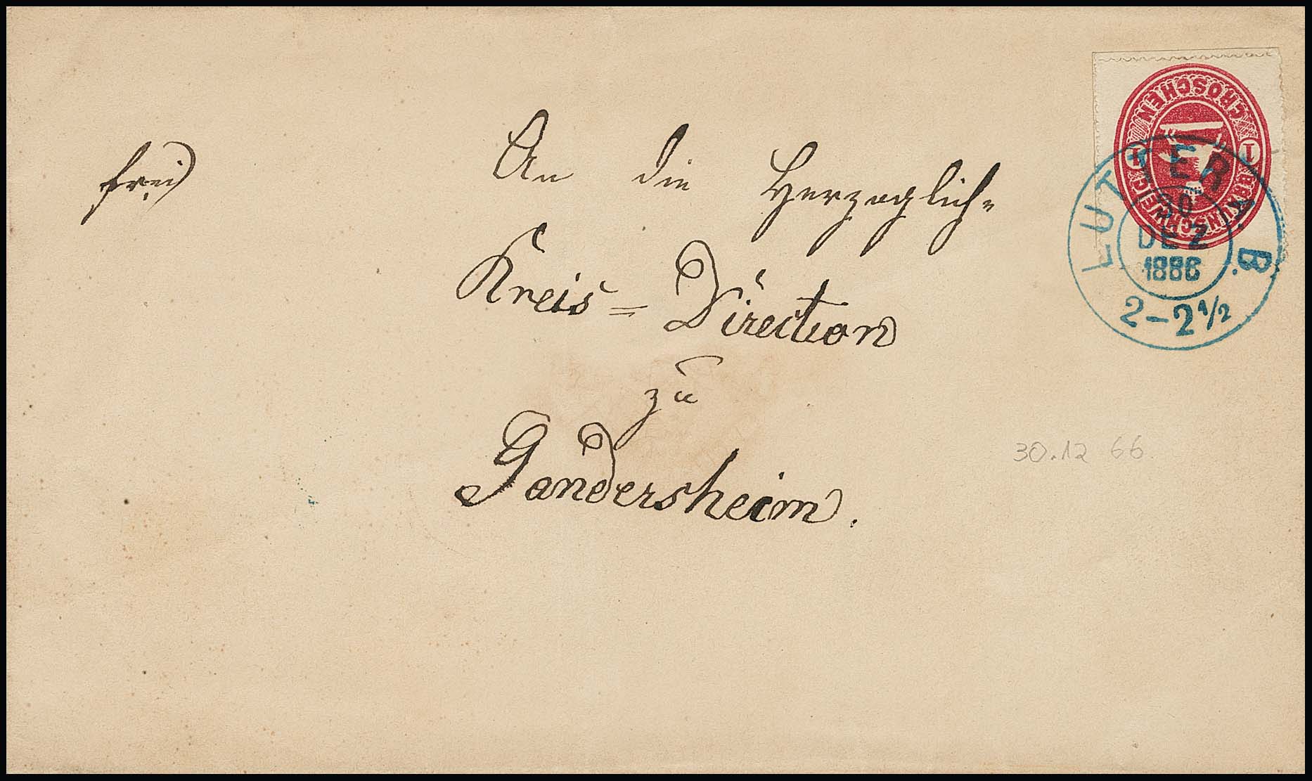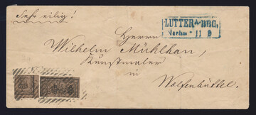 "32" nebst K2 "Lutter a.B." klar auf Brief Wappen 1 Gr., dazu weiterer Brief Wappen 1 Gr. mit blauem K2 von Lutter als Markenentwertung