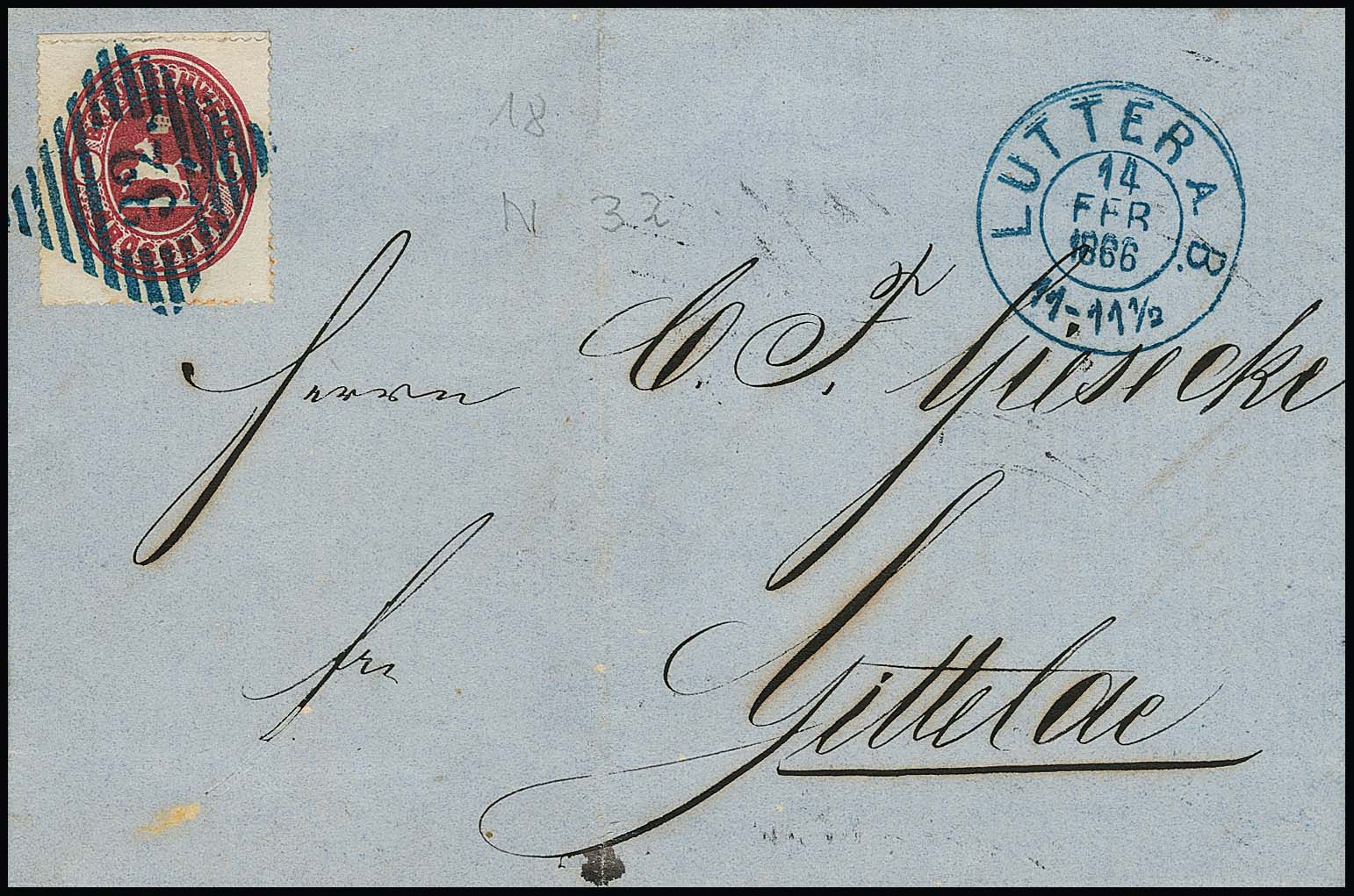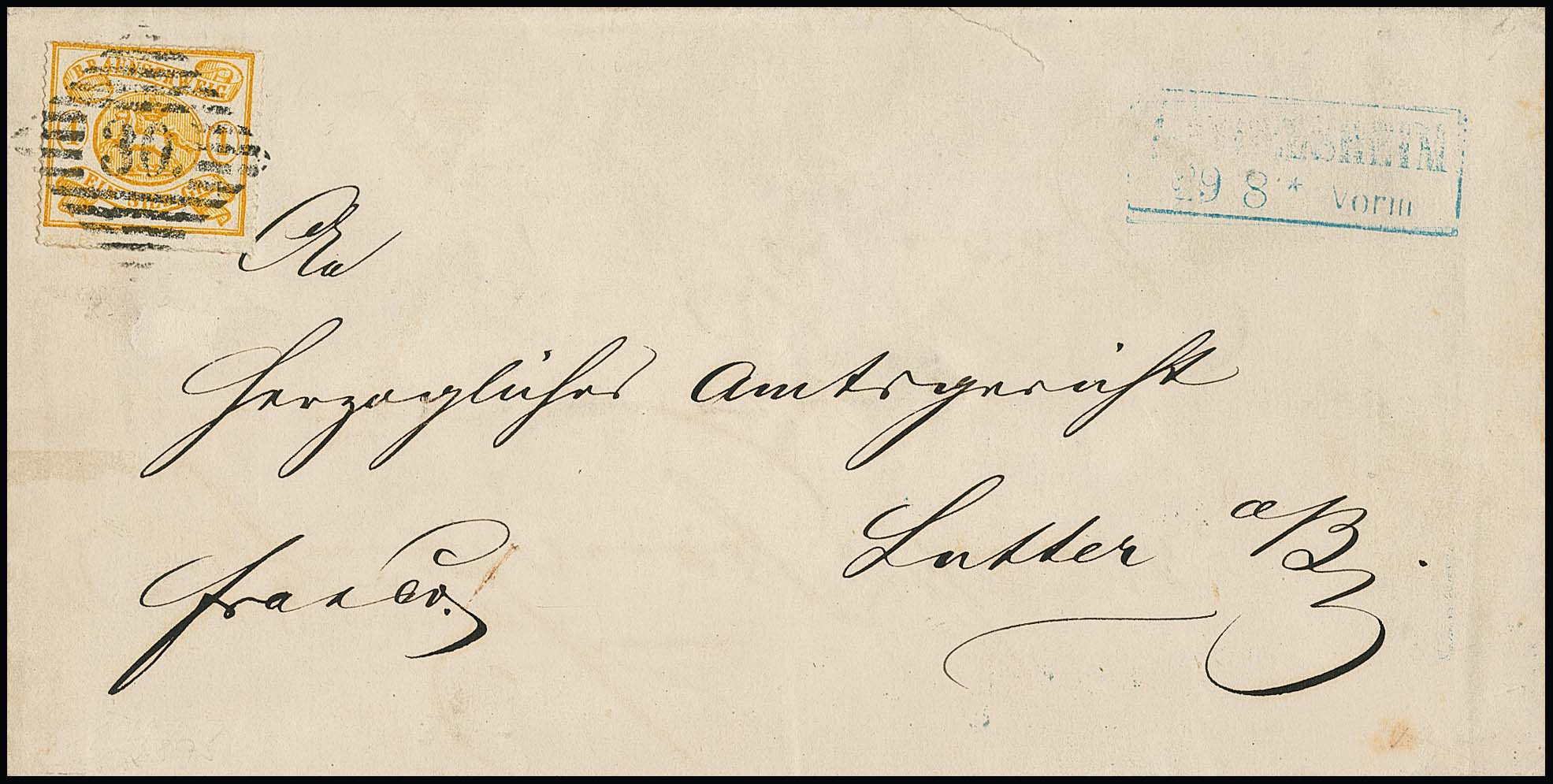"32" nebst blauem Ra2 "Lutter a. Bbg." auf Damencouvert (leichte Faltspuren ausserhalb) mit 1/4 und 2/4 Ggr., sign. Lange