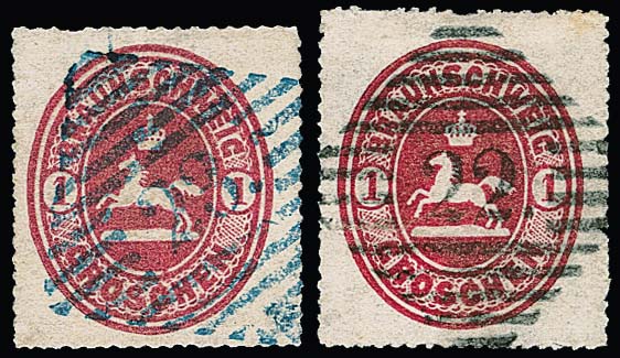 "22" (Hessen, schwarz), "23" (Hohegeiss, blau), je klar auf Wappen 1 Gr. karmin, kl. Mängel, Feuser 400,-