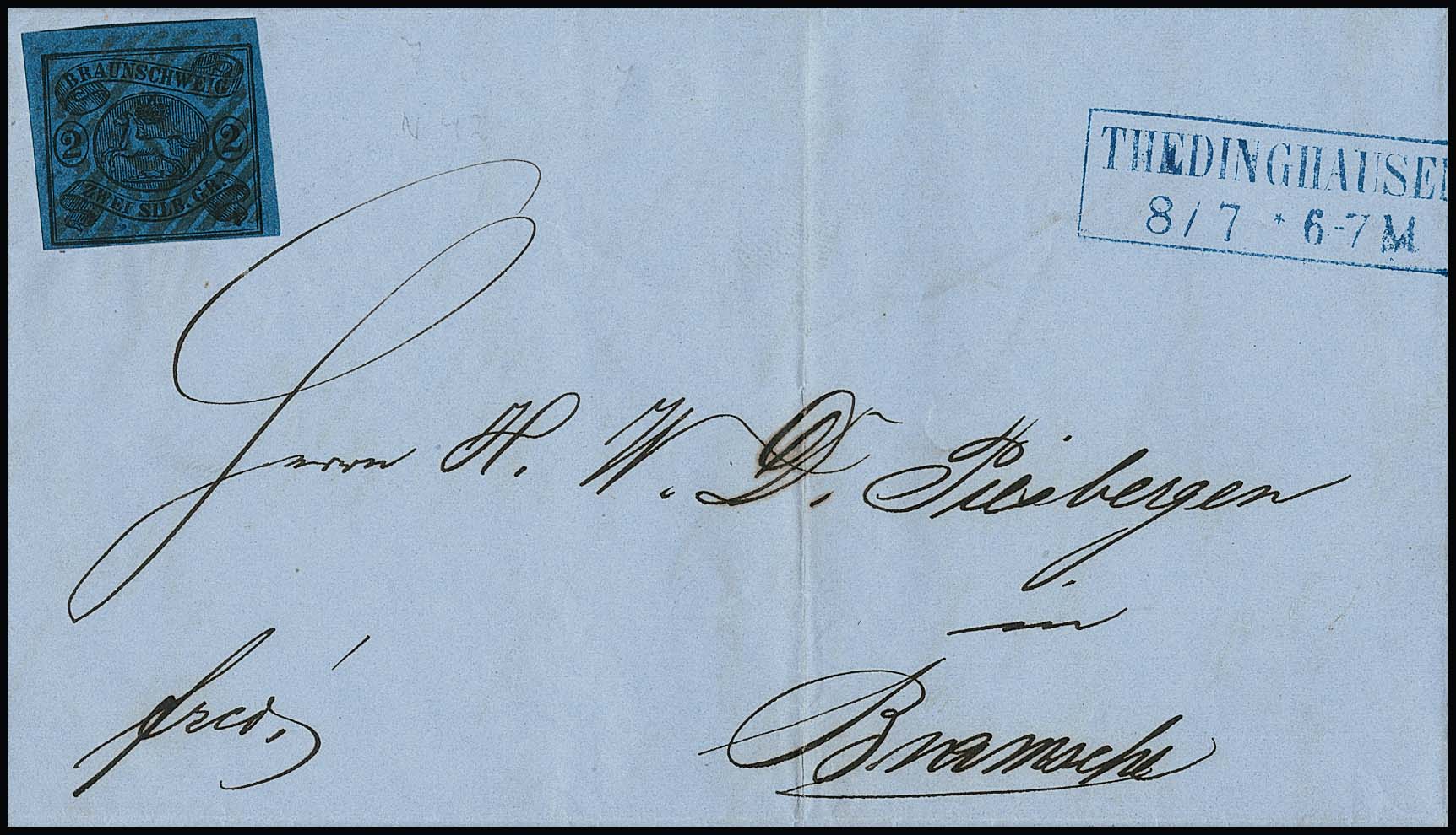 "42" nebst blauem Ra2 "Thedinghausen" auf gef. Brief mit perfekter 2 Sgr. schw./blau (überrandig)