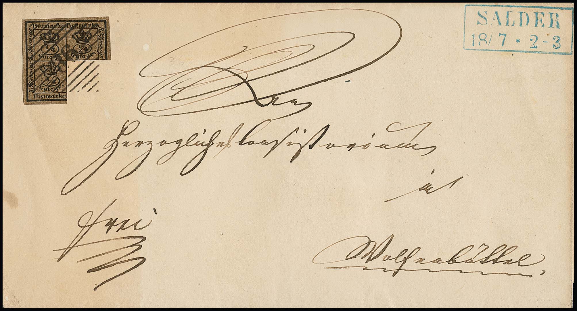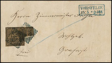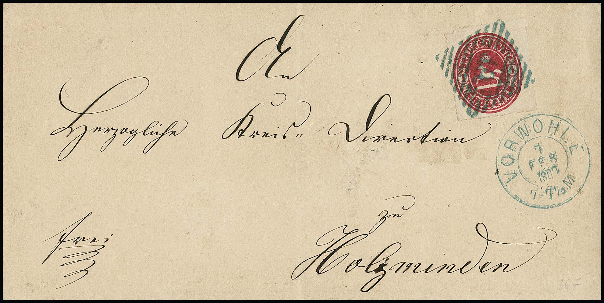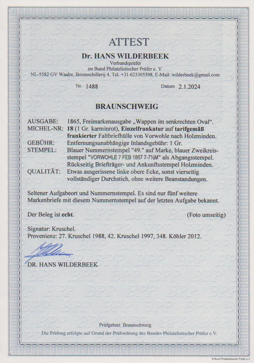 "49" nebst K2 "Vorwohle" je in blau klar auf Brief mit Wappen 1 Gr. karmin (Eckfehler) nach Holzminden, ein besonders schöner Beleg des seltensten Nummernstempels auf der Wappen-Ausgabe, Attest Dr. Wilderbeek. Feuser 2500,-, es sind nur sechs Briefe mit diesem Nummernstempel auf der letzten Ausgabe bekannt
