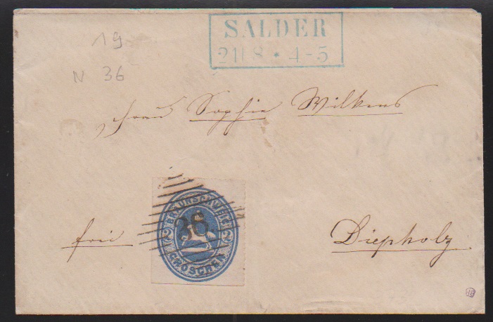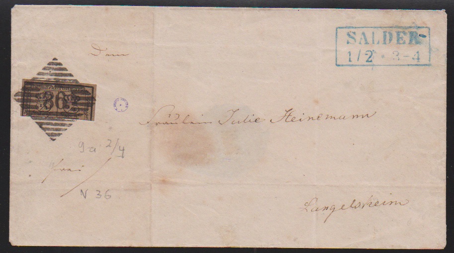 "36" (dicke und dünne Balken) je nebst blauem Ra2 "Salder" auf zwei Briefen 2/4 (Brief Falten ausserhalb) bzw. 3/4 Ggr.