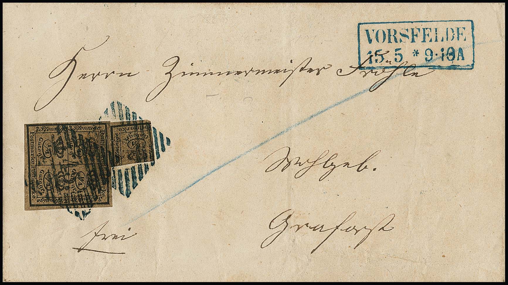 "45" nebst Ra2 "Vorsfelde", je in blau, auf Brief mit 4/4 und 1/4 Ggr.