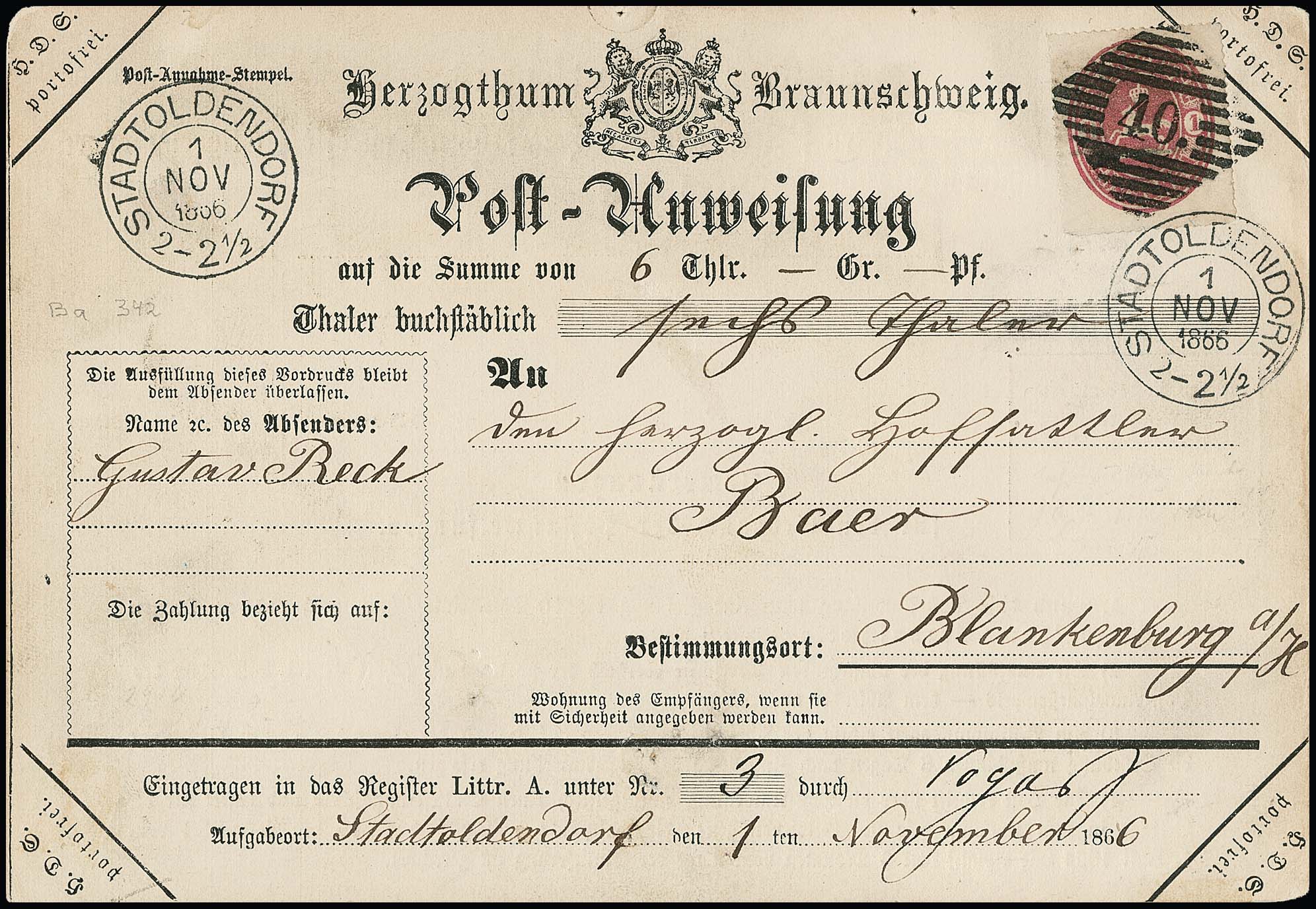 "40" nebst K2 "Stadtoldendorf" klar auf Postanweisung mit Wappen 1 Gr., min. Mgl., sign. Brettl