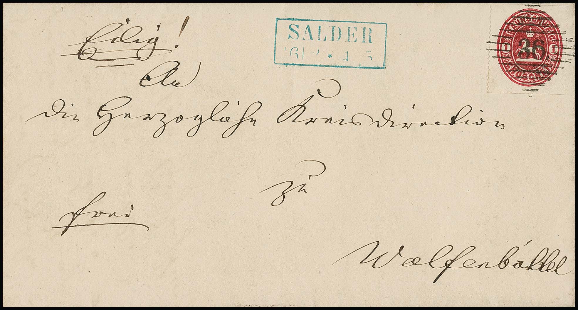 "36" (dünne Balken) je nebst blauem Ra2 "Salder" auf zwei Wappen-Briefen 1 bzw. 2 Gr. mit für diesen Ort bei der letzten Ausgabe typischen Scherentrennungen ein- bzw. zweiseitig