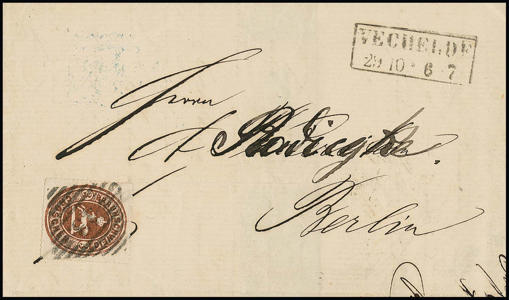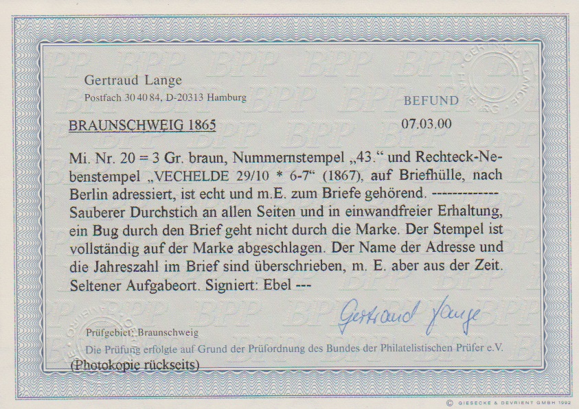 "43" nebst Ra2 "Vechelde" auf Brief (Adressname überschrieben) mit Prachtstück Wappen 3 Gr., Fotoexp. Lange. Mi. 600,-