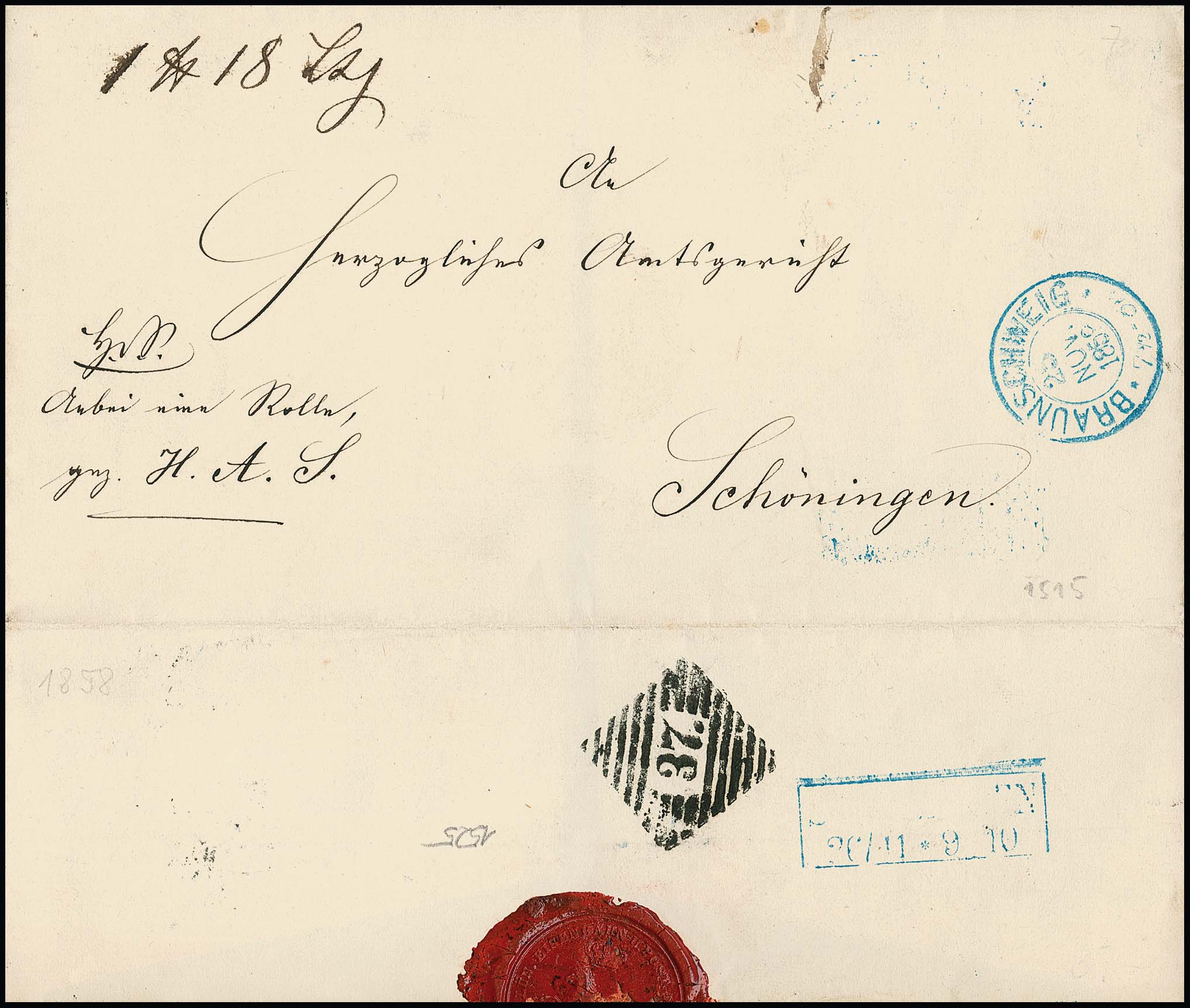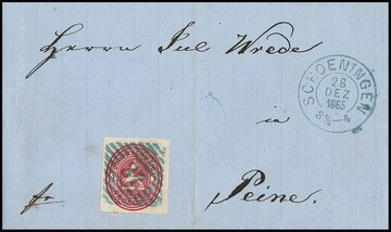 "37" nebst K2 "Schoeningen", je in blau, auf Brief mit Wappen 1 Gr. (min. Randtönung), dazu gef. Brief 1 Gr. mit Orts-K2 "Schoeningen"