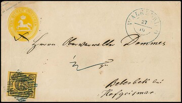 "46" nebst K2 "Walkenried" je in blau klar auf breitrandiger 1 Sgr. schw./bräunlich (kl. Spalt) auf Ganzsachen-Couvert 1 Sgr. gelb (Randfleck) nach Beberbek bei Hofgeismar, ein interessanter Beleg aus dem seltenen Harz-Postort, Attest Wilderbeek