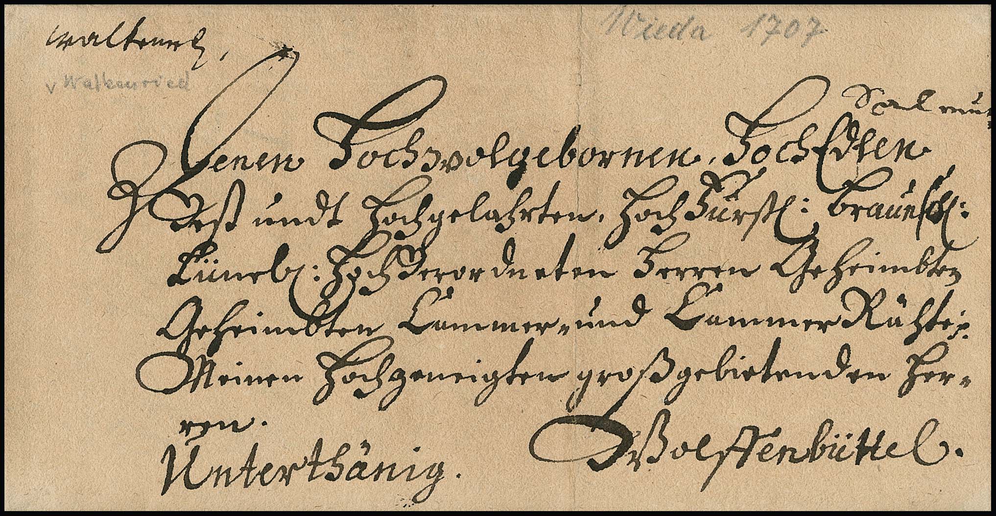 "Walkenried", 1707, sehr frühe handschriftliche Aufgabe "v. walkenrd" auf Brief mit Inhalt aus Wieda