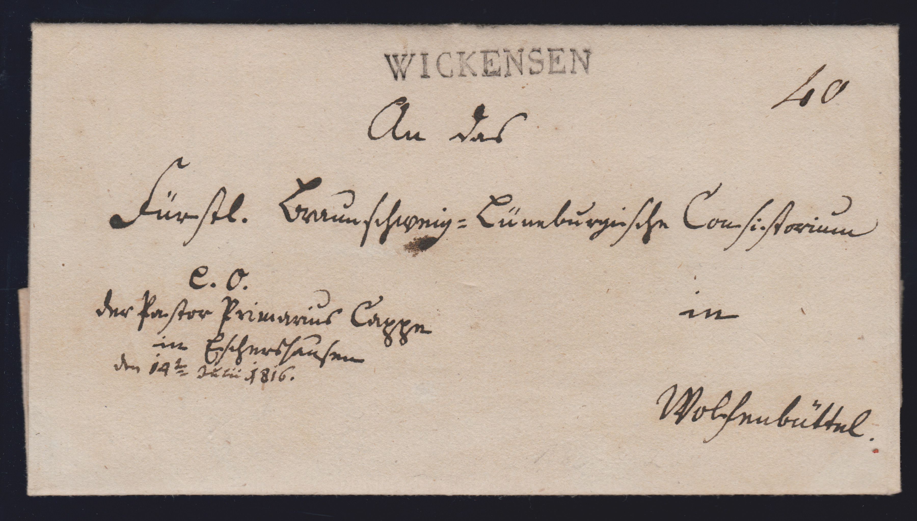 "Wickensen", seltener Postort, zwei Briefe mit handschriftlichen Aufgaben, 1790 "W" und 1796 "v.W" (Rötel), dazu L1 auf Brief 1816