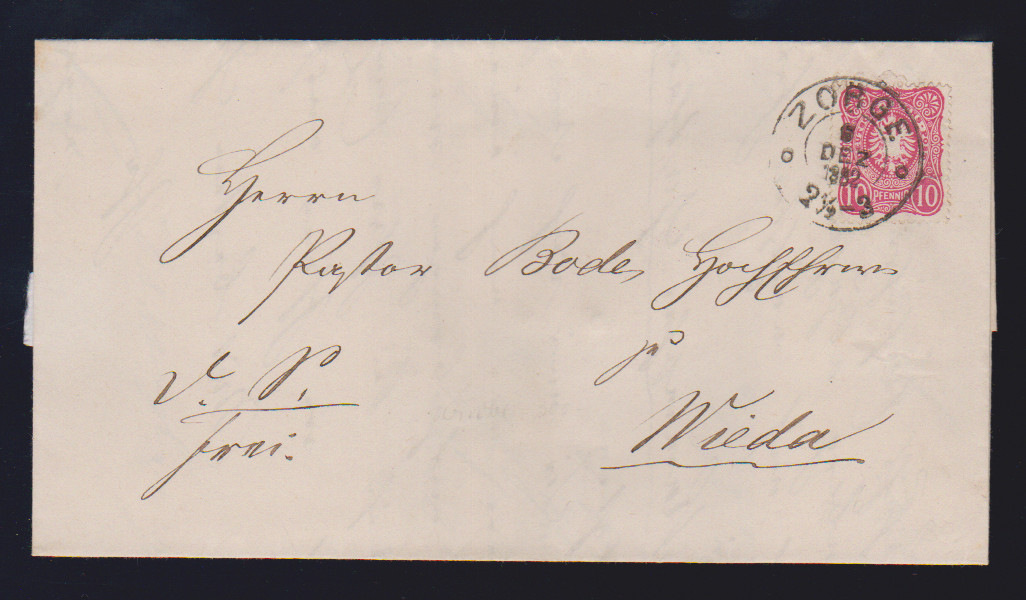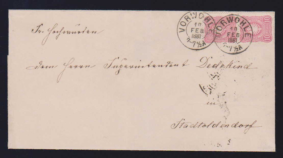 "Vorwohle", nachverw. K2 klar auf Brief 1881 mit Paar 10 Pfg.