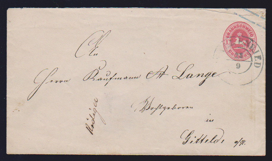 "Wolfenbüttel", sehr seltener nachverw. großer Grotesk-K2 klar auf NDP-Pracht-Ganzsachen-Couvert 1 Gr. rosa, Feuser 500,-