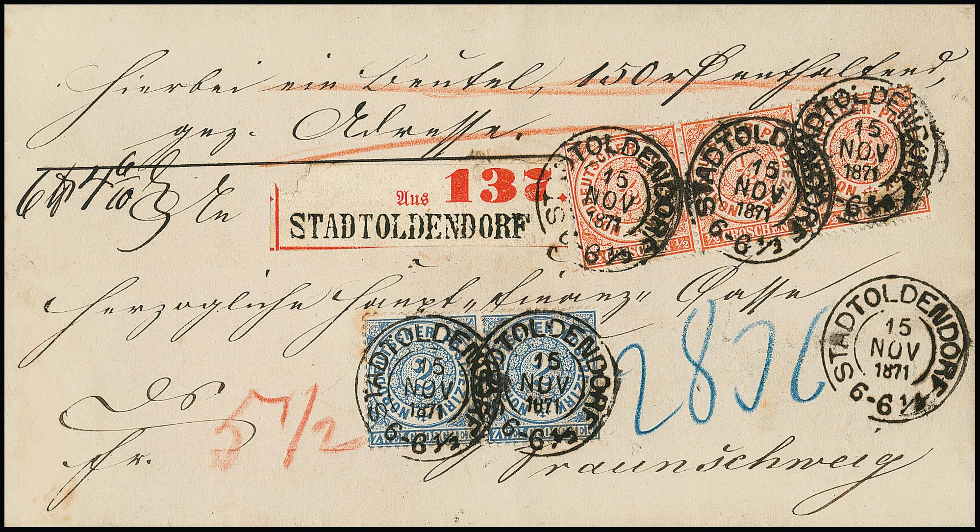 "Stadtoldendorf", nachverw. K2 auf interessantem Paketbrief (Paketzettel mit L1 "Stadtoldendorf") mit Dreierstreifen NDP 1/2 Gr. orange und Paar 2 Gr. ultramarin (linke Marke unbed. getönte Ecke)