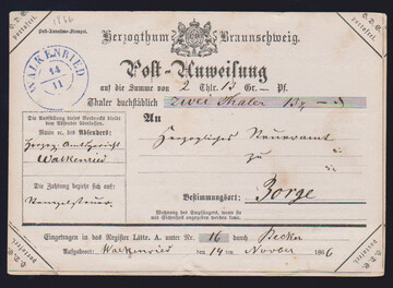 "Walkenried", seltener blauer K2 klar 1866 auf Postanweisung (rs. seltener K2 "Zorge")