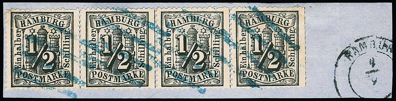 1/2 Sch. schwarz, seltener Viererstreifen (ausgabetypisch kurze Zähne bzw. ein winziger Spalt) auf Briefstück mit blauem Balkenstempel und Neben-K2 des Mecklenburger Postamts, tadellos sign. Bühler. Mi. 1200,-