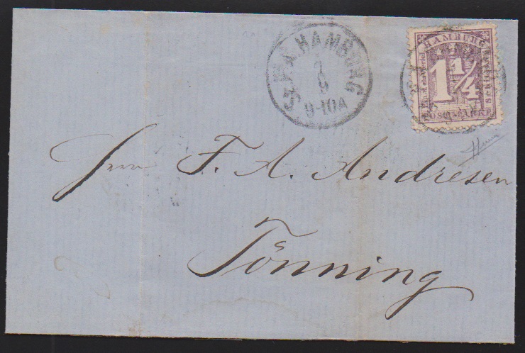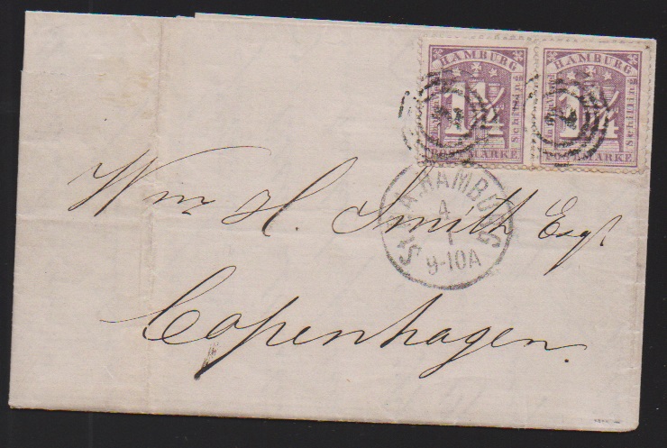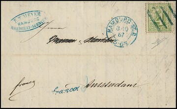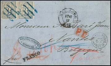 3 Sch. ultramarin per zwei (einmal unbedeutend stumpfes Eckzähnchen) auf Brief von Hamburg 1867 adressiert nach "Nantes Belgien", erst versehentlich nach Belgien und dann mit interessanten Taxen richtig weiter nach Nantes/Frankreich gesandt