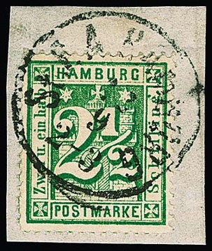 2 1/2 Sch. blaugrün, Kabinettstück mit zentrischem dänischem NS "2", Fotoexp. Mehlmann. Mi. 180,-