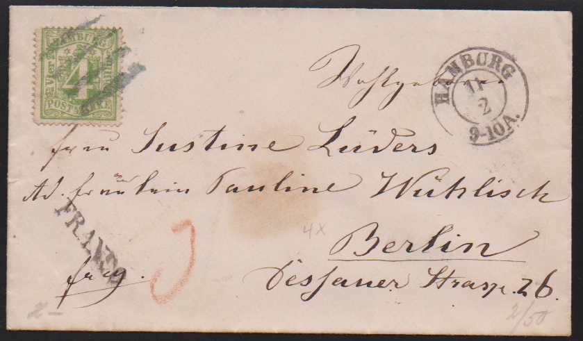 4 Sch. bläulichgrün auf Prachtcouvert von Hamburg nach Berlin, Mi. 300,-
