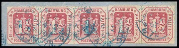 1 1/2 Sch. rosakarmin, Paar (winziger Kratzer) und Dreierstreifen auf Prachtbriefstück mit blauem K2, wohl die höchste Mehrfach-Frankatur dieser Marke, aus der Kuphal-Slg. (Zuschlag Kruschel 1983 DM 2200,-), sign. Kruschel, Hunziker
