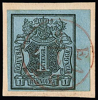 "Hannover", (1850), äusserst seltener roter Ra3 auf dekorativer Briefhülle nach Calenberg, in rot sind nur zwei Briefe bekannt, ein Liebhaberbrief (erworben für 3500,- Euro!)